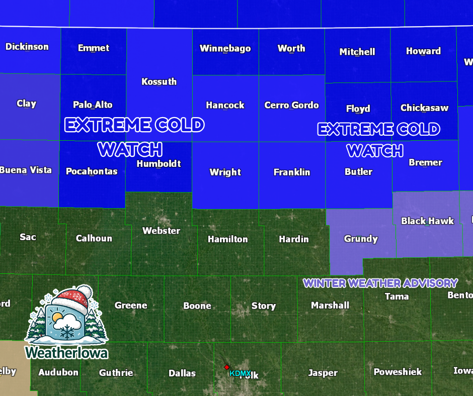 An Extreme Cold Watch has been issued for portions of north central, northeast, and northwest Iowa, with dangerously cold conditions expected from late Thursday night through Saturday morning.